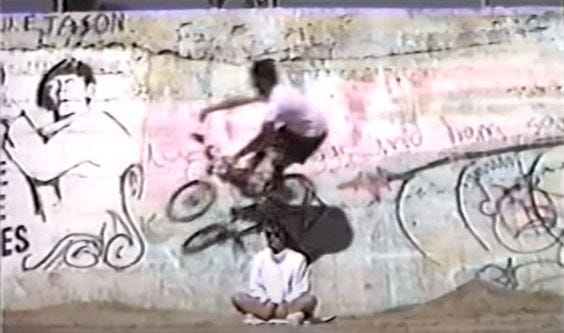 This is me, searching for the stoke. This was one of my favorite places to ride in the late 1980’s and 1990’s, the Blue Brothers Wall in Huntington Beach. Wall ride over my sister Cheri’s head in 1990. The wall is under vert, maybe 80 to 85 degrees, so you can ride higher than on a fully vert wall, and really stick to it. This is a still shot from the intro of my 1990 self-produced BMX video, The Ultimate Weekend.