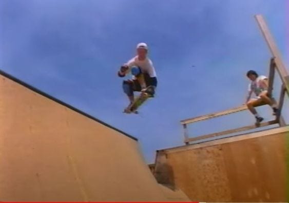This is pro skater, Ken Park, airing over the 7 foot spine, at Tony Hawk’s Fallbrook ramp, in 1989. That’s me sitting on the rail in the background. I was Don Hoffman’s assistant that day, and shot some video of Ken, for Vision Skateboards’ Barge at Will video (44:50). Don was the founder of Unreel Productions, the video production company owned by Vision Skateboards and Vision Street Wear clothing. That year, 1989 was the peak of the 1980’s wave of skateboarding. The popularity wave crashed. Skating, and BMX freestyle, my sport then, “died" and went underground until 1995. That year, ESPN jumped into the action sports world with The Extreme Games. Renamed The X-Games in 1996, the worldwide TV coverage brought attention and major sponsors in to the action sports world for another wave of popularity. This was Ken’s best video part of the 1980’s era, and it was cool to see him knock his best stuff out. Tony Hawk wasn’t there that day, and has no idea who I am, just to be clear. I’ve seen Tony at events, but never actually met and talked to him.