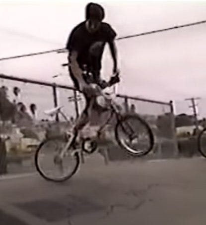 Me, with a bank trick in San Diego, in 1990. This is a 270 bunnyhop onto the top of the bank, to 90 bunnyhop, to rollback to 180 out. Video still from my 1990 BMX video, The Ultimate Weekend (36:19).