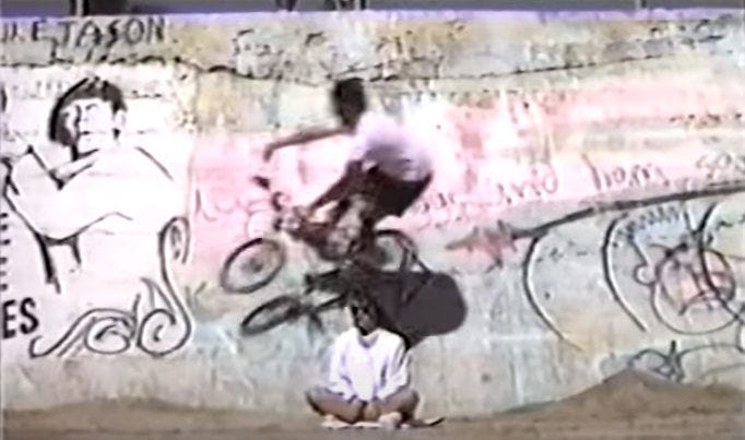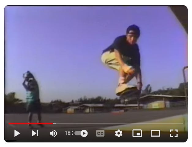 Wall ride over my sister Cheri’s head, in 1990. The location is the Blues Brothers Wall in Huntington Beach, California. To the left of the Three Stooges mural was a mural of the Blues Brothers, that’s where the wall got its name. This is another video still from The Ultimate Weekend, I have very few photos of my years of riding, and only a bit of video.